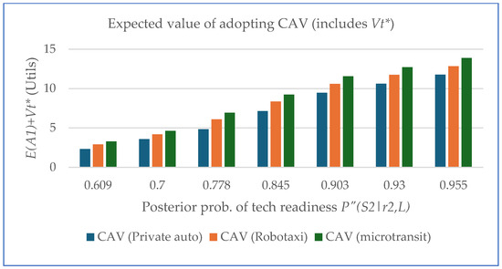 The expected gain of adopting the Level 4 CAV (in all application cases) increases with increased prior probability P′(S2), corresponding posterior probability P″(S2|r2,L), and improved reliability of new information (i.e., increase in conditional probability P(r|S,L)). For improved robustness of Level 4 CAV adoption results, higher conditional probabilities are desirable.