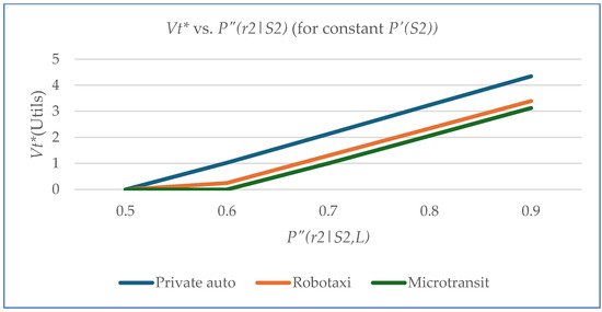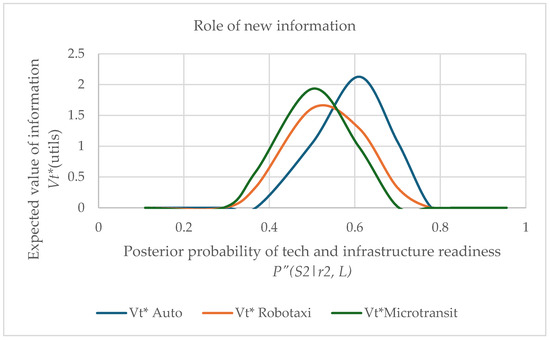 The results show that at a conditional probability of 0.5, Vt* is zero for all applications (i.e., there is no role for new information obtained from a low reliability L in reducing risk). This is also the case for a conditional probability of 0.6, but only for microtransit. Another observation is that the value of new information increases with increased conditional probability. In relative terms, the private mobility CAV benefits the most from risk reduction and microtransit has the lowest need for risk reduction obtainable in the form of new information. These results are illustrated in Figure 12.