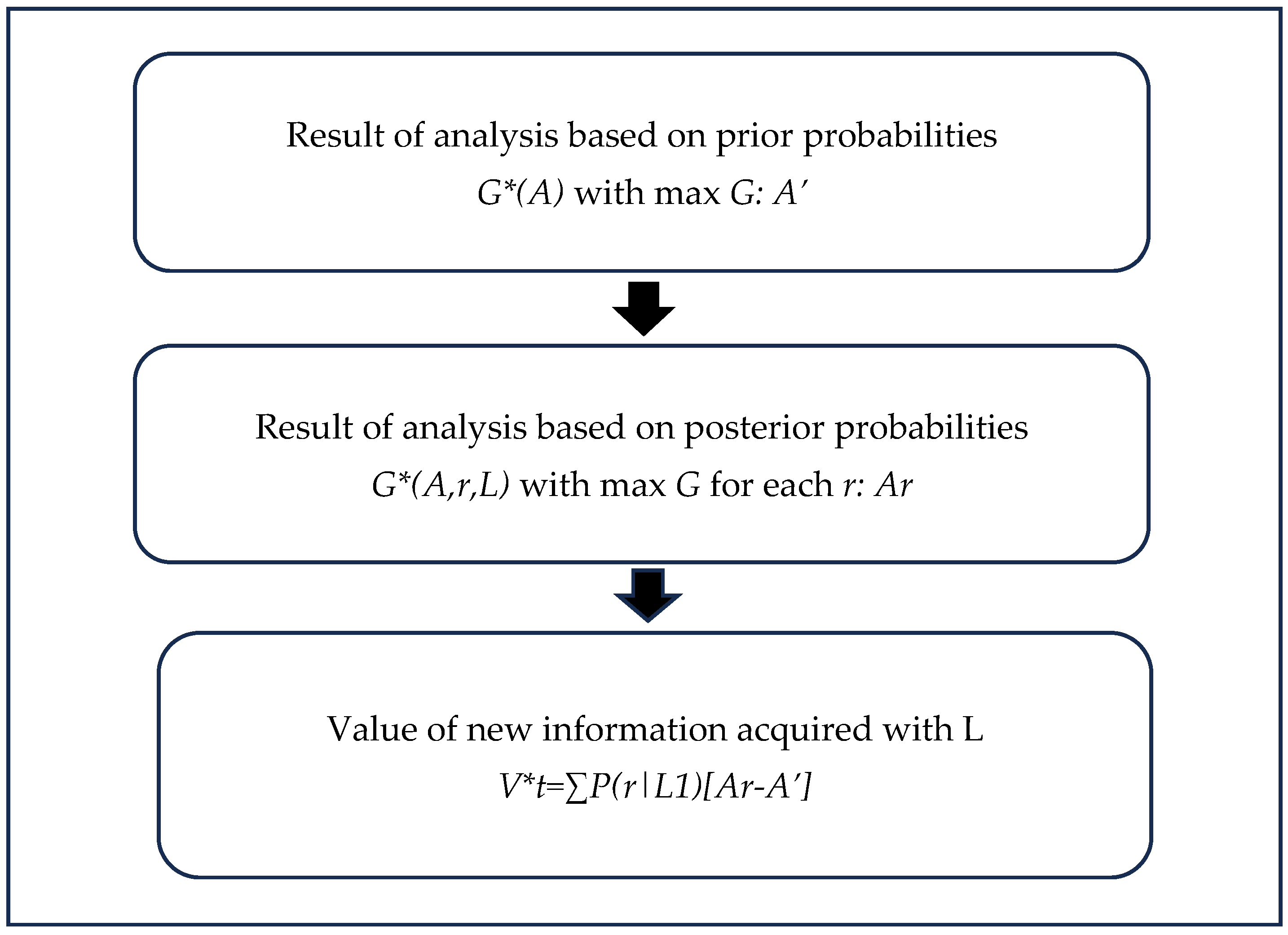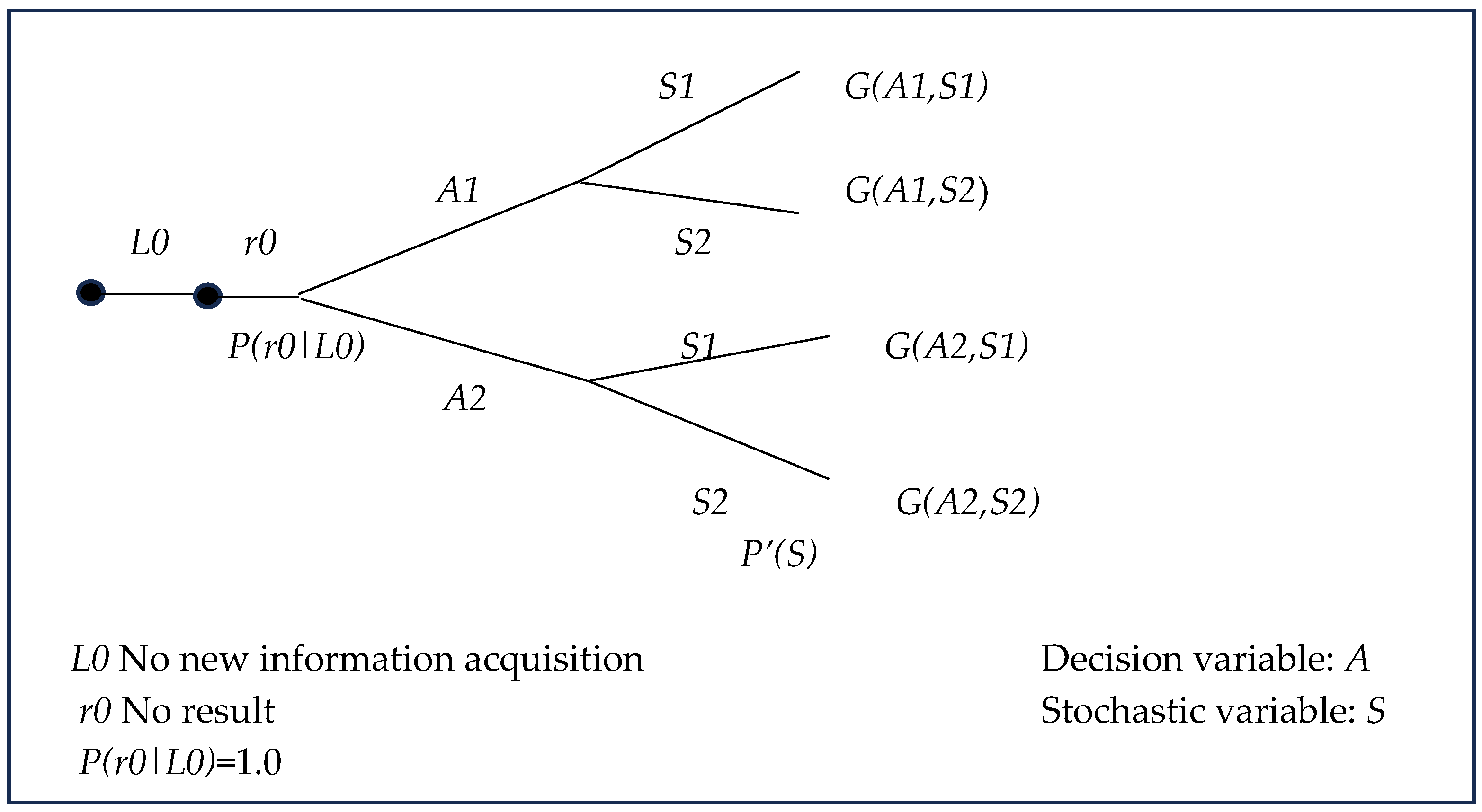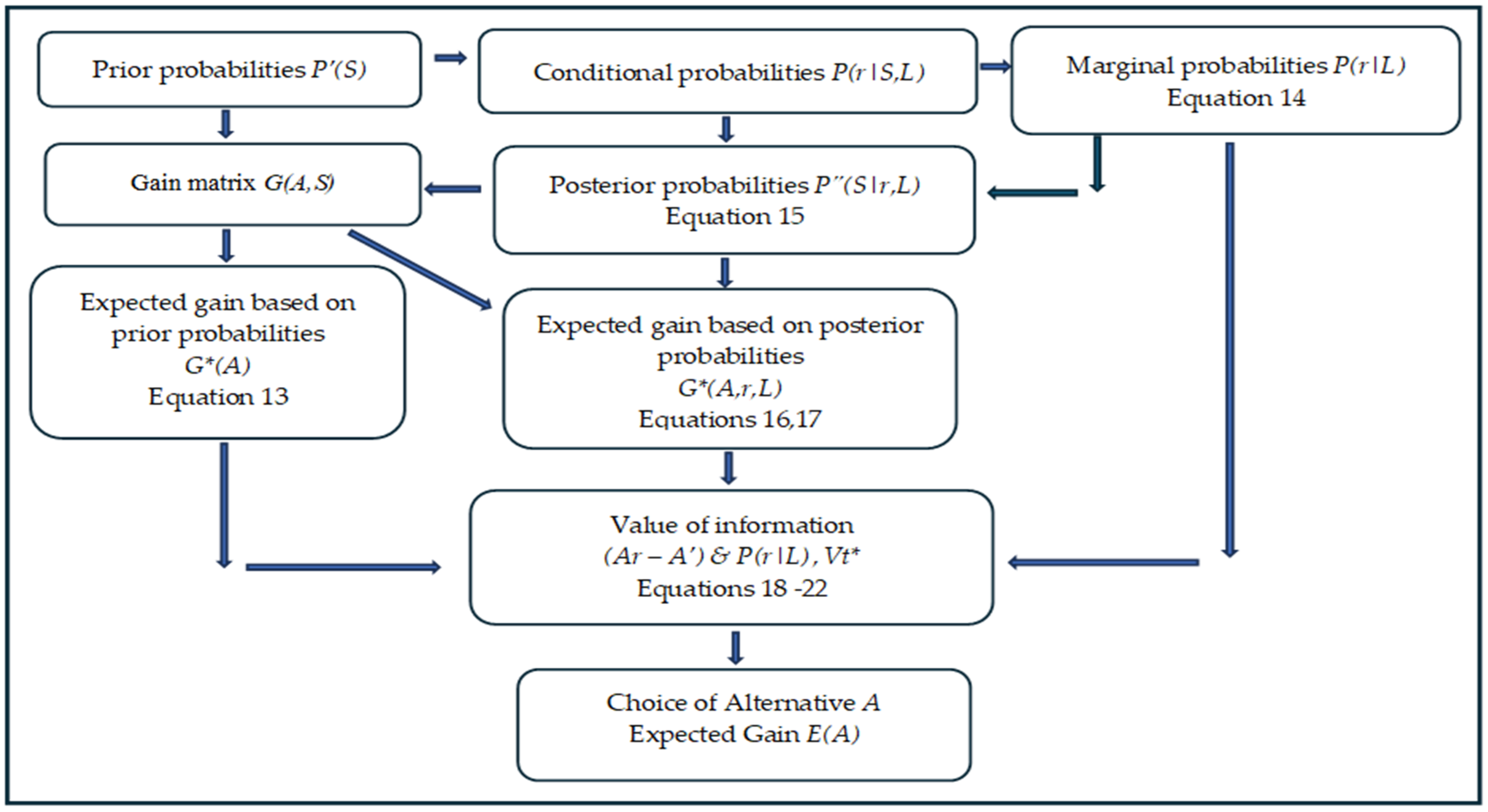 - A conditional measure P(r|S,L) is to be assigned, which represents the probability that the result r will be observed if the learning activity L is carried out, and S is the true state. That is, the analyst should define the reliability of the information outcome r of L in predicting the true state S.