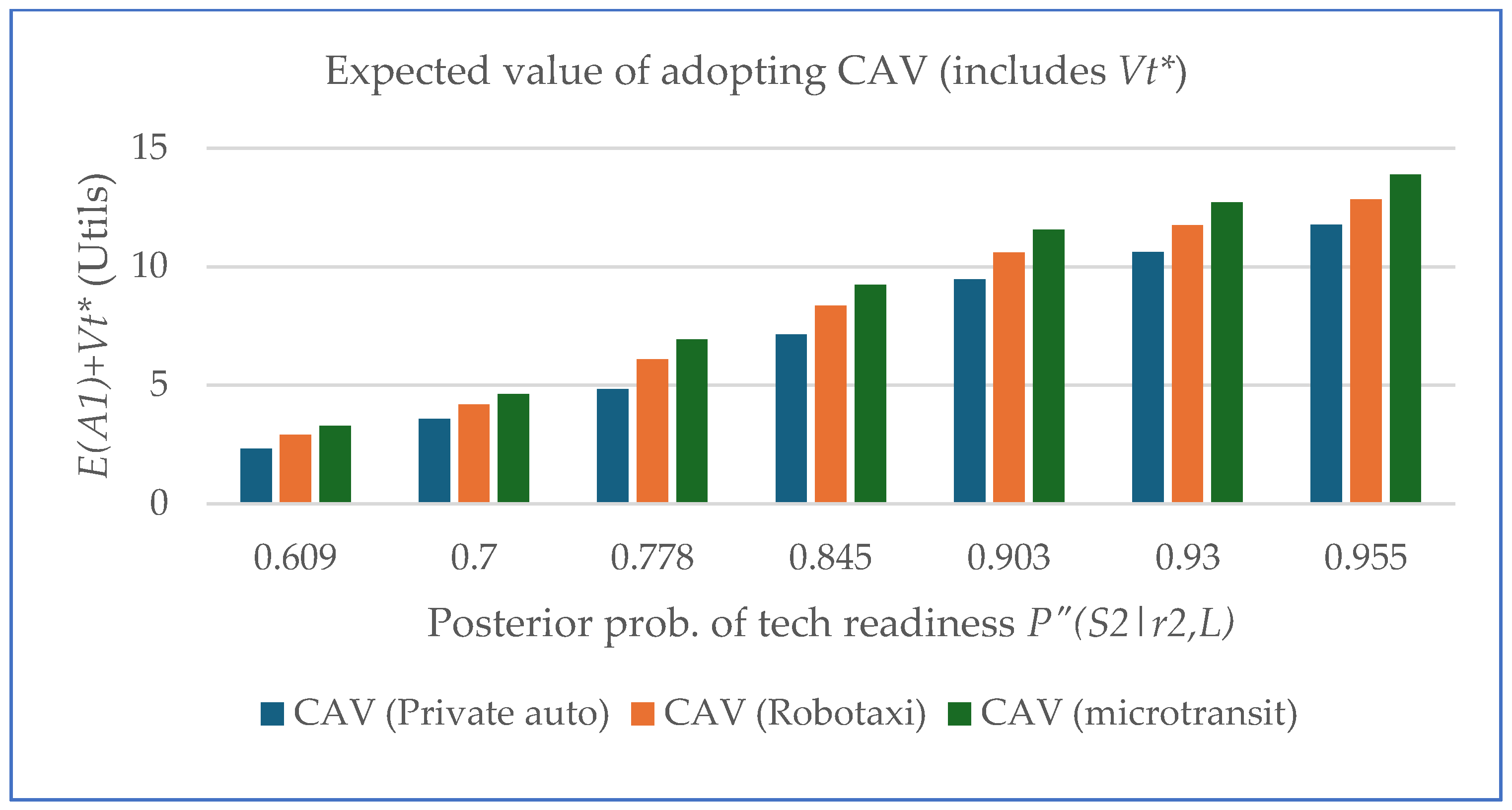 - Cr3 Socio-economic benefits: The overall range of 15 to 40 utils reflects a general lack of experience in obtaining socio-economic benefits from the new technology. Some authors include driving-related savings in this category of CAV effectiveness. In relative terms, the CAV under S2 has higher potential to generate benefits than under S1 due to favorable technology and infrastructure developments [12,45,61].