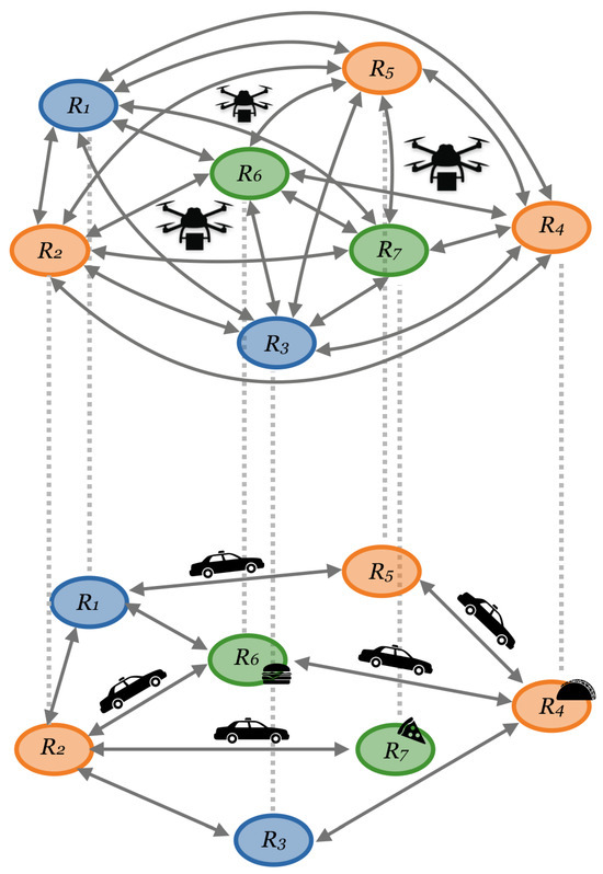 Illustration of the meal delivery service. Heterogeneous customers are distributed across different regions of a transportation network (indicated by different colors) and may place orders from various regions. Delivery is performed through multiple transportation modalities, each operating within a distinct transportation network, resulting in different routing options. The arrows indicate the links between the regions (nodes), while dotted lines connect identical nodes across the networks.