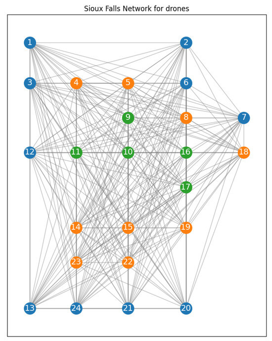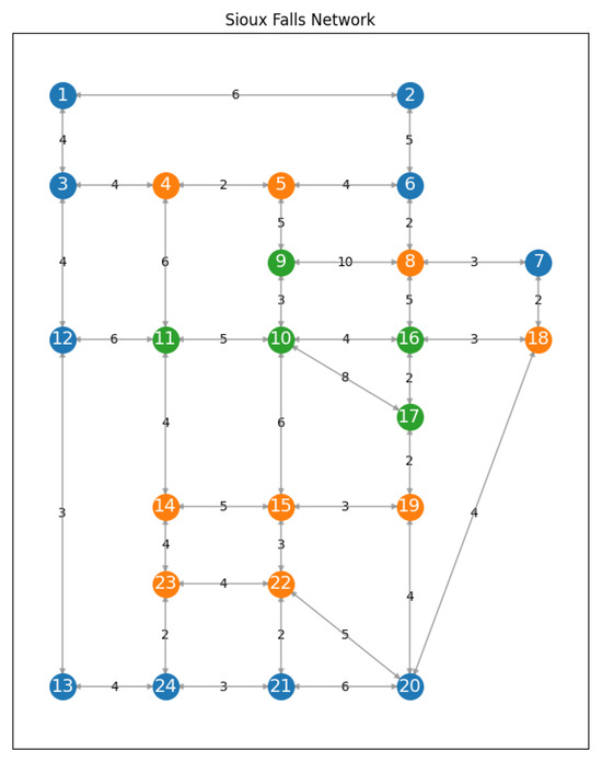 Sioux Falls graph for cars. The green nodes represent regions in Downtown. The orange nodes indicate the Inner Ring, and the blue nodes represent Suburban areas. Each link represents a connection between two nodes with the corresponding travel time.