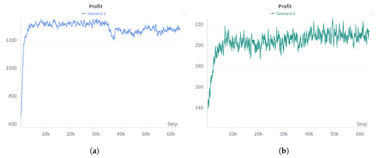 Figure A1 illustrates the training curves of all PPO agents. PPO1, PPO3, and PPO5 exhibited the most stable performance during training for Scenario 1. In Scenario 2, however, the stability in performance does not vary significantly across agents. Note that the horizontal axis in Figure A1 represents the number of policy updates rather than the total number of environment steps. Therefore, PPO6 and PPO7, which use twice the value of , have only half as many updates compared to the other agents.