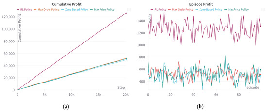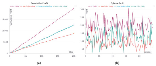 Profit trajectories for the first scenario over 100 episodes, each consisting of 200 time steps. (a) Shows the cumulative profit of the meal delivery platform under different policies. (b) Illustrates the profit aggregated per episode.