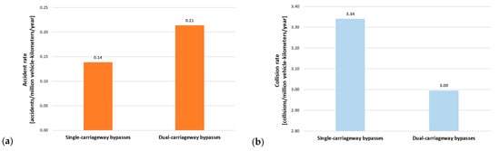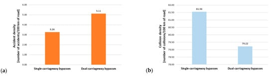 Figure 4), the three-year average accident concentration on dual-lane bypasses is higher than on single-lane bypasses. The analyzed dual-lane bypasses have higher traffic volumes than single-lane bypasses. The higher concentration on these sections may be due to more frequent accidents with heavy traffic and not necessarily indicative of a higher level of danger. The average concentration of collisions was higher on single-lane bypasses. This is interesting given the lower overall number of collisions on these bypasses relative to dual-lane bypasses. The important point here is that single-lane bypasses have much lower traffic volumes compared to dual-lane bypasses, which, with a similar or even lower number of collisions, can result in a higher value of collision concentration.