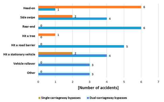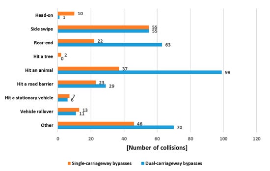 An analysis of the types of accidents on bypasses shows that the type that occur most frequently is strongly related to the cross section of the road. Different road equipment, the types of intersections used, and space limitations have a significant impact on the possibility of a particular accident. It is also worth noting that not all types of incidents carry the same risk to traffic users. Head-on collisions occurring on single carriageway bypasses are among the most dangerous types of events and are most often associated with high accident severity. In contrast, guardrail invasions and rear-end collisions, while numerous and equally dangerous, usually result in fewer injuries.