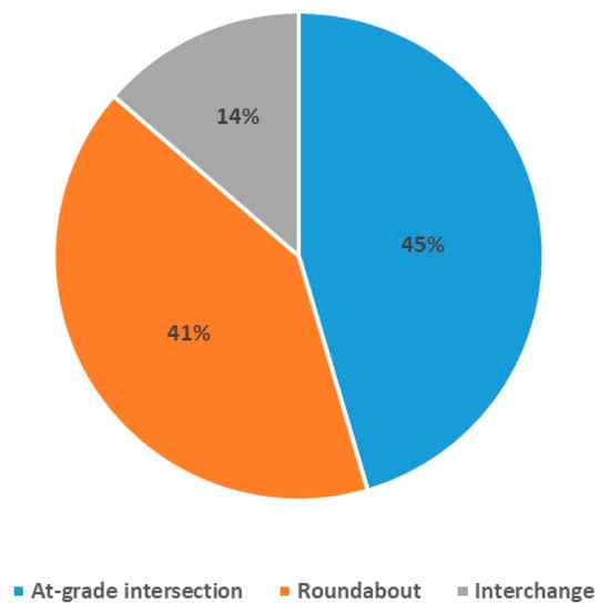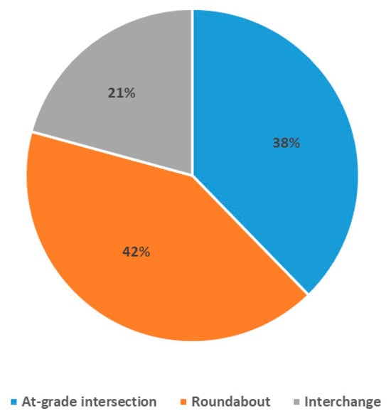 13]. Their design also allows for future expansion, making them a flexible and scalable solution for high-volume bypasses. For bypasses with lower traffic volumes, roundabouts or signalized intersections may suffice; however, for high-volume corridors, interchanges are the preferred option from a safety perspective. The result obtained in this study is nothing revealing, but it is worth highlighting, as often, due to the cost aspect, road infrastructure managers abandon the construction of intersections and choose single-level intersection variants, which can worsen the level of safety on designed bypasses.