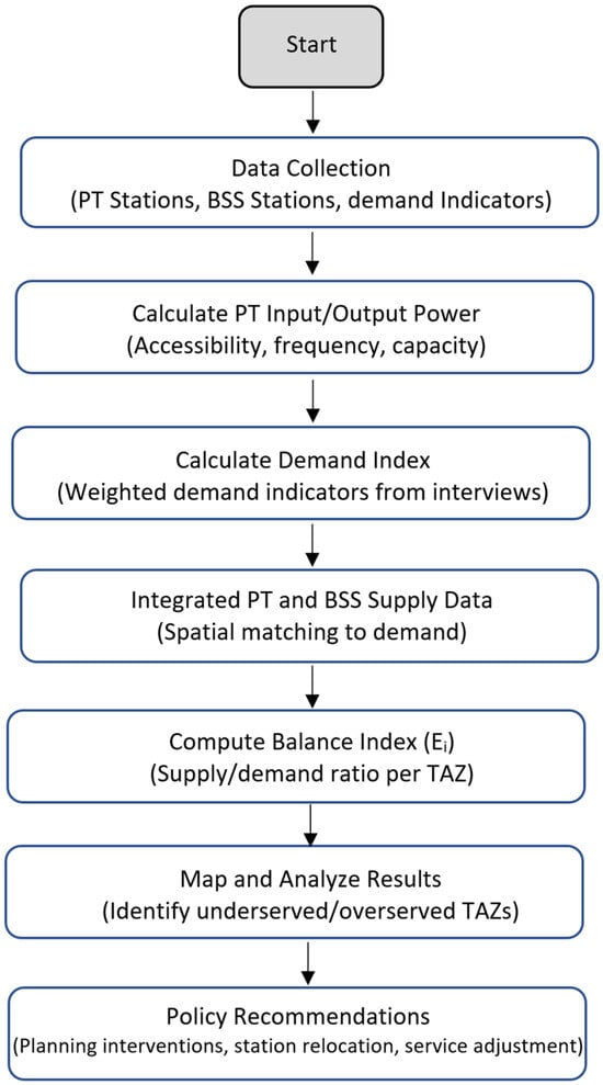 In this study, TAZs are selected as the spatial units for evaluating the supply and demand of PT and BSS across the city. Figure 1 illustrates the methodology, showing a flowchart of the proposed analytical framework.