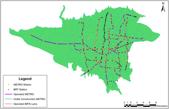 In this study, Tehran was selected to analyze both the service provision and the distribution balance in its PT system. Tehran experiences a daily total of approximately 19.3 million trips, with nearly half attributed to public transportation services, according to official statistics [50]. To conduct the analysis, data on the BRT system—which consists of 235 active stations and ten lines (as of January 2021)—along with data from Tehran’s metro network—which has 115 stations and seven lines—were provided by the Tehran Deputy for Traffic and Transportation. Data on BRT and metro infrastructure correspond to January 2021, which was the latest verified dataset at the time of model implementation. Tehran also has a Bike-Sharing System that began operating in 2018, with 30 stations in service as of January 2021.