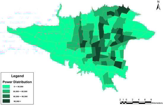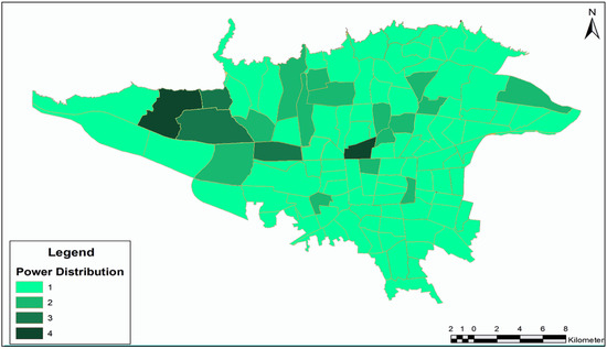 The final accessibility index (Ai) for each TAZ is derived by integrating two core components: the PT power and the connectivity of BSS stations to nearby PT nodes within a walkable distance. Each component is first normalized and classified on a five-level scale. This integration allows Ai to reflect both the service intensity of PT and the availability of first-last-mile connections through BSS. Therefore, areas with both high PT service levels and strong BSS connectivity achieve higher Ai values, while underserved zones in either mode score lower. This formulation ensures that Ai captures not only proximity but also multimodal accessibility strength, supporting a more equitable and realistic assessment of transport service coverage.