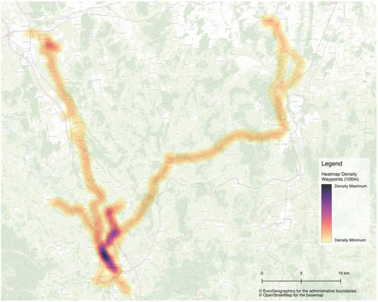 Heatmap of tracked trips in a rural area (Allgäu) (created by the authors).