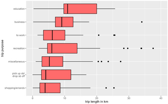 Boxplot of distribution of trip lengths per purpose.