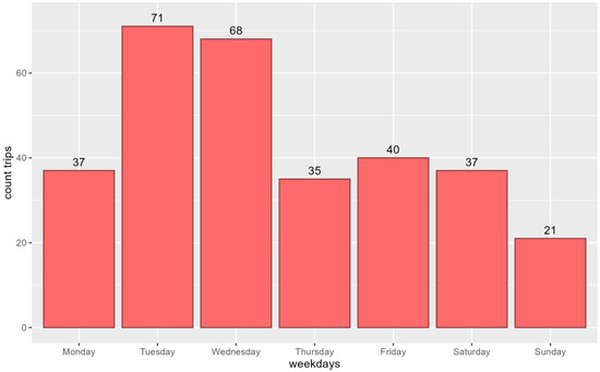 Also, the usage patterns per weekday show that the LEV is an integral tool to fulfill daily necessities and private errands for our sample (see Figure 5). During the 47 day survey period, the LEV trips per person were tracked with a median of 18.5 days (SD = 22.87). This suggests, also based on the questionnaire answers given in the next passage, that not all trips covered by LEVs were recorded by the tracking system. The wide range of the participants’ recording (range = 1–97 days) results in the high standard deviation observed in the data. The questionnaire also provides insight into how many days of the week the participants were using their LEV. In total, a large share of the participants, 19 of 23 persons, stated that they use their LEV five or more days per week. This is in line with the results of the qualitative pre-study. There, the participants stated that they use the LEV for all trip purposes within its range. However, the perceived higher comfort of car usage in some cases leads to a preference to use the car instead of the LEV. One participant of the pre-study, P1, uses the LEV for all trips except those that exceed its range, but now drives it less often due to having purchased a more comfortable EV. P2 uses the LEV for all trips, including longer distances with intermediate charging, mainly for driving children, private errands, and commuting to work. P3 plans to use the LEV for all trips in the future, while P4 uses it only within its range and prefers a second car for comfort, using it for 80% of the trips.