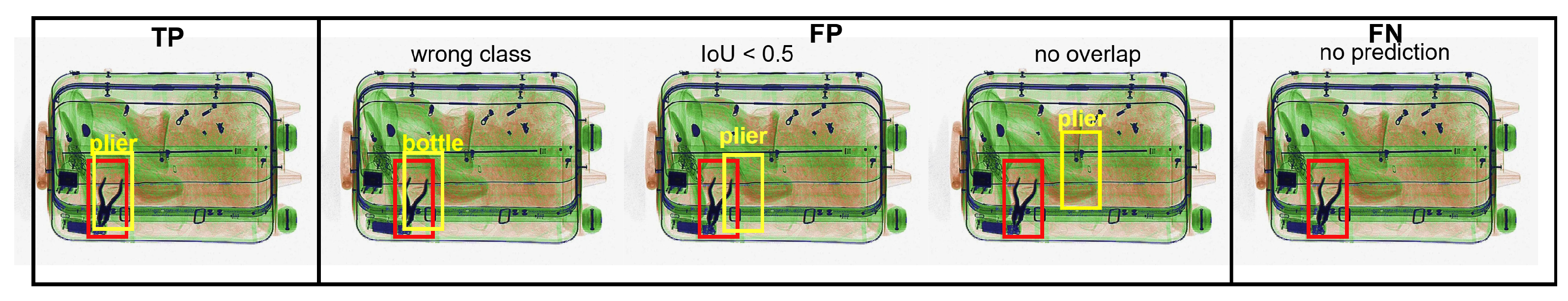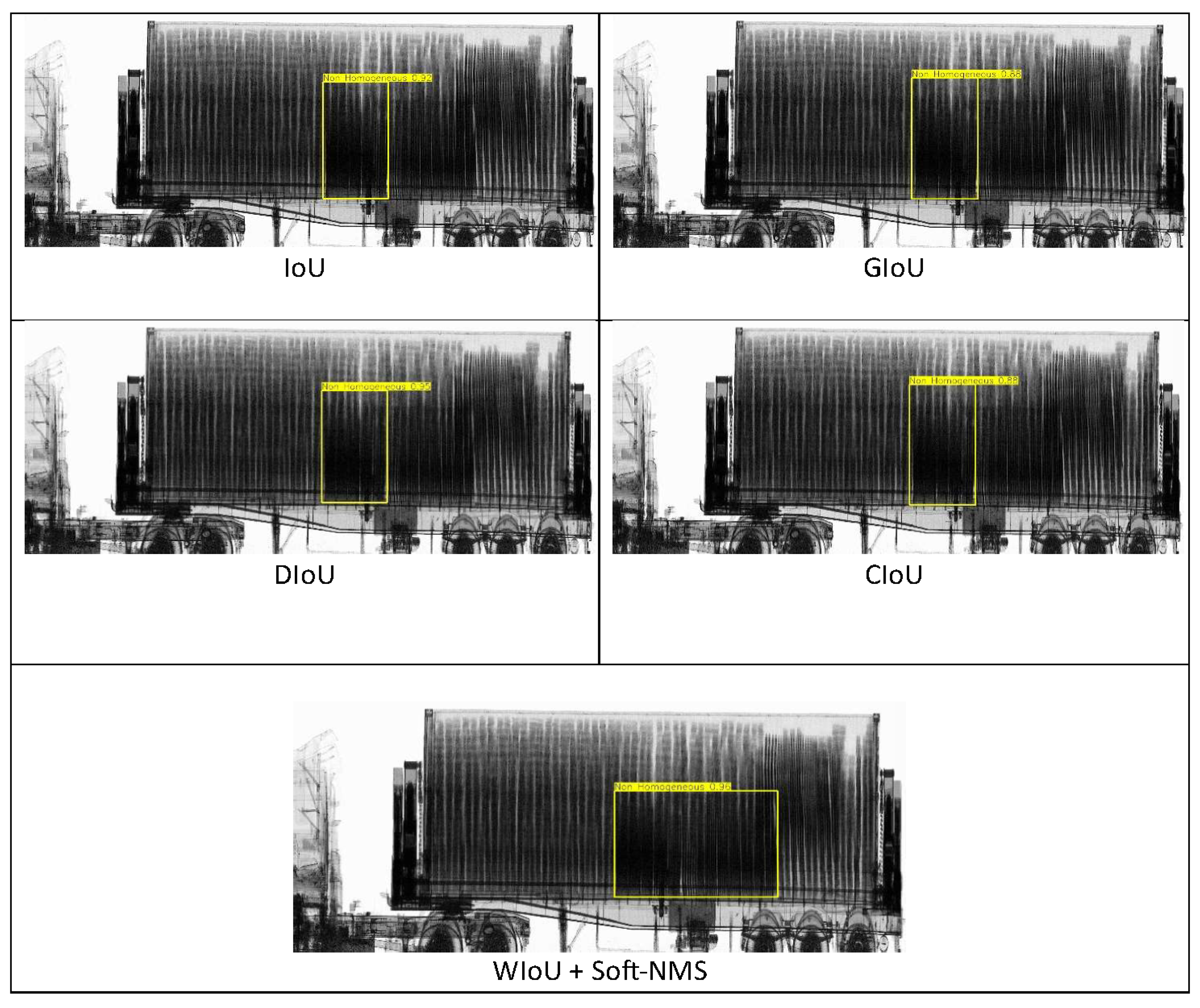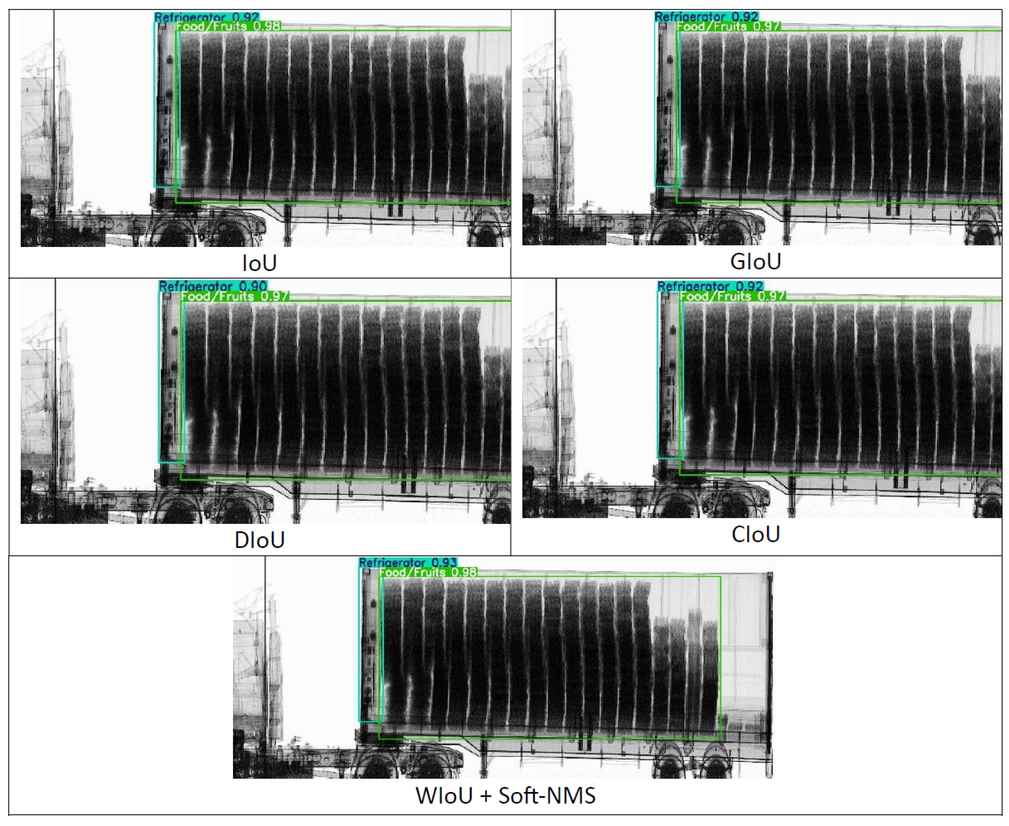 - The combination of advanced IoU-based loss functions and soft NMS significantly reduces the rates of false positives and false negatives, particularly for occluded or overlapping prohibited items in X-ray images of cargo.