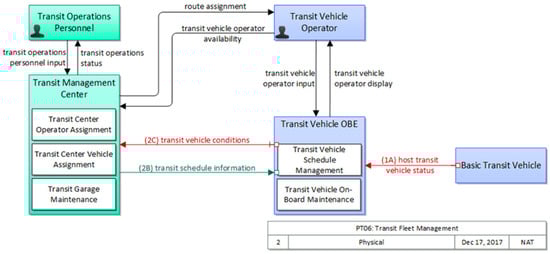 The most relevant ARC-IT service area to this work is the public transportation area, which includes services identified as relevant, such as “Transit vehicle tracking service”, “Transit fixed-route operations service”, and “Transit Fleet Management”. The last service is focused on the automatic maintenance of traffic scheduling and monitoring (Figure 1 shows the physical diagram of this service, with each of the components, aspects, and roles). This figure shows the “Traffic Management Center” component, which is responsible for processing the collected information and scheduling preventive and corrective maintenance for the system. This service also facilitates the daily maintenance of the transportation fleet inventory, as well as the assignment of specific schedules, routes, and operators to the system [].