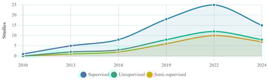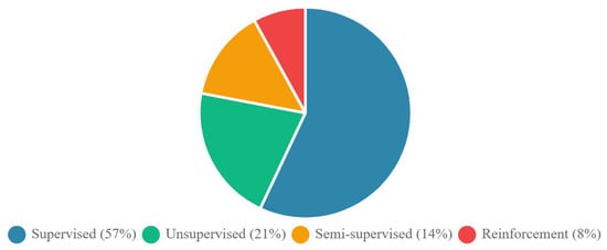 Figure 2 illustrates the predominant use of supervised learning approaches, which accounted for 57% of the selected studies (