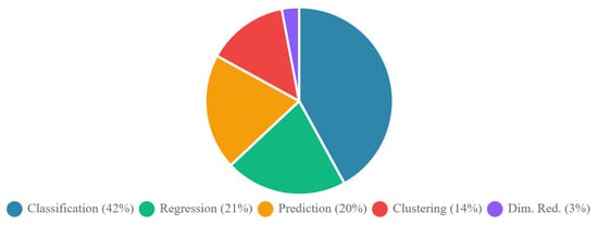 Figure 3, offers essential insights into the preferences for problem formulation within the research community. Classification problems dominated the research landscape, accounting for 42% of the studies (