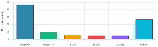 Figure 4 illustrates the comprehensive distribution of specific machine learning techniques, highlighting the significant technological preferences within the research community. Deep Neural Networks exhibited a predominant presence with a 47% adoption frequency (