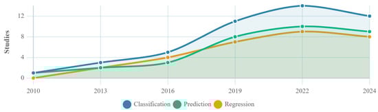 Prediction tasks have demonstrated parallel growth trajectories, with marked acceleration observed post-2016, culminating in 10 studies by 2022. This trend reflects an increased interest in temporal forecasting applications, coinciding with the maturation of deep learning techniques. Similarly, regression tasks have shown consistent development since 2013, reaching a peak of nine studies by 2022, indicating sustained demand for continuous variable prediction capabilities. Temporal progression illustrates a shift in research from simple statistical approaches to sophisticated predictive modeling, with significant acceleration during 2016–2022, corresponding to advancements in computational infrastructure and algorithmic developments.