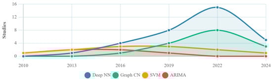 The utilization of traditional techniques has resulted in a marked decline. Specifically, the use of Support Vector Machines has decreased from a notable presence in 2015, with three studies, to minimal adoption in 2024, with only one study. Similarly, the ARIMA models were completely abandoned after 2020 following the initial adoption period from 2010 to 2016. These trends reflect a shift within the field from traditional statistical methods to more advanced machine learning techniques, highlighting the rapid cycles of technological adoption and responsiveness of the research community to algorithmic innovations.