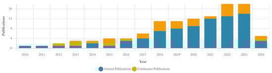 Throughout the study period, journal publications consistently demonstrated dominance, particularly in recent years (2020–2024), indicating a preference within the research community for peer-reviewed high-impact dissemination channels. Conference publications have maintained a steady contribution, with notable peaks observed between 2019 and 2021, reflecting a balance between the presentation of preliminary findings and the documentation of comprehensive research. The overall trajectory of publications illustrates the successful establishment of the field, which is characterized by a robust academic foundation and sustained research momentum.