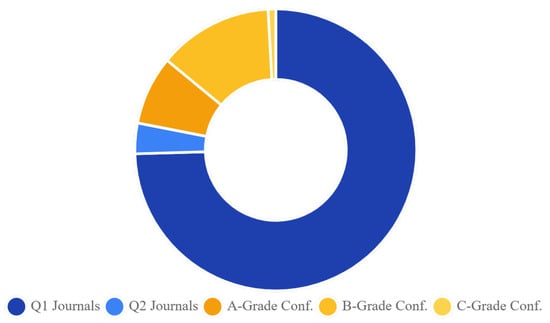 Q2 journals constituted a minor proportion, representing 4% (n = 4) of the total, suggesting a pronounced preference for publishing in top-tier channels. The distribution of conference publications revealed a stratification in quality: A-grade conferences accounted for 9% (n = 9) of the total output, indicating selective engagement with premier academic forums; B-grade conferences comprised 15% (n = 15), reflecting efforts to disseminate research more broadly; and C-grade conferences represent a minimal 1% (n = 1). This distribution of quality underscores a mature research community with established standards and a successful positioning within high-impact scholarly venues.