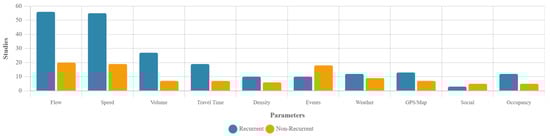 Research on nonrecurrent congestion highlights distinct parameter priorities. While flow (20 studies) and speed (19 studies) remained significant, event-based data assumed increased importance (18 studies), underscoring the incident-driven nature of nonrecurrent congestion. In addition, weather data (nine studies), GPS/map data (seven studies), and travel time (seven studies) were pertinent for monitoring dynamic conditions, suggesting the need for methodological adaptations to address unpredictable congestion scenarios.