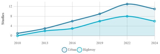Figure 17) examined the focus on different road types over the 14-year study period, highlighting the consistent predominance of urban road research. This area has shown steady growth, beginning with one study in 2010, reaching a peak of 13 studies by 2022. In parallel, highway research exhibits a similar trajectory, albeit with a slightly delayed acceleration, culminating in 11 studies by 2021. This trend suggests increasing recognition of the importance of corridor-level congestion management and the potential for methodological integration.