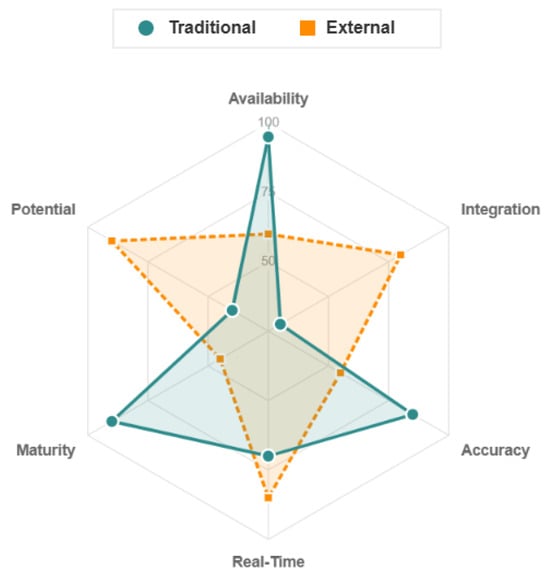 Figure 18 presents a comprehensive comparison of the data strategies between traditional and external data sources across the six evaluative dimensions. Traditional data sources exhibit superior performance in the established operational dimensions of availability (95%), accuracy (85%), and maturity (90%), reflecting the proven infrastructure and institutional knowledge. However, limitations are evident in adaptation capabilities: integration (30%), real-time processing (70%), and potential (40%) indicate the need for modernization.
