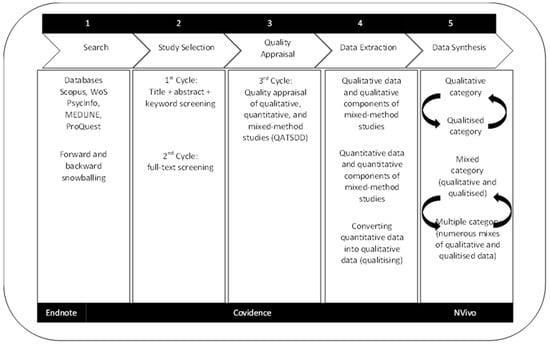 - Stern, C.; Lizarondo, L.; Carrier, J.; Godfrey, C.; Rieger, K.; Salmond, S.; Apóstolo, J.; Kirkpatrick, P.; Loveday, H. Methodological guidance for the conduct of mixed methods systematic reviews. JBI Evid. Synth. 2020, 18, 2108–2118. [Google Scholar] [CrossRef]