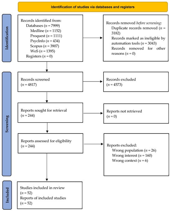 By applying the search strategy to the first cycle, 7999 hits were generated and 4817 studies remained after duplicates were removed. Covidence automatically removed 3043 duplicates and the lead reviewer manually flagged 139 studies as duplicates. Non-peer reviewed studies such as books or chapters were excluded. The inclusion of books or chapters that do not contain scientifically approved results, which are often presented in various ways, can lead to distorted findings in systematic reviews. Considering the title–abstract–keywords, 4573 studies were marked as irrelevant and excluded. At the end of this stage, 244 studies passed the first sifting cycle and were processed for the second cycle. A detailed overview can be found in Figure 1. A sample of 10% of all decisions made by the lead reviewer was critically reviewed, and the results were confirmed by a second reviewer/author (S.P.). No additional changes were necessary.