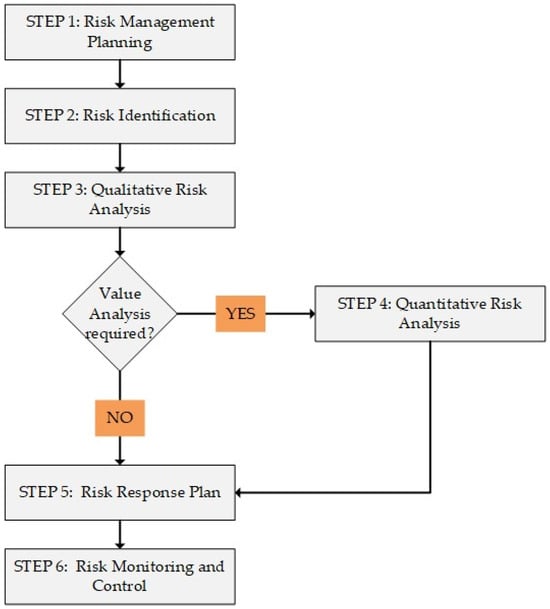 In support of a systematic approach to risk management, the Project Management Institute (PMI) outlines a widely adopted six-step risk management framework that serves as a foundation for many construction management strategies. These steps include (1) Risk Management Planning, (2) Risk Identification, (3) Qualitative Risk Analysis, (4) Quantitative Risk Analysis, (5) Risk Response Planning, and (6) Risk Monitoring and Control. This structured sequence ensures that risks are not only identified but also evaluated, prioritized, and continuously monitored throughout the project lifecycle [7]. To visually summarize this progression, a simplified version of the risk management process adapted from Ashley et al. [8] is presented in Figure 1. Figure highlights the decision-making flow between qualitative and quantitative analysis steps, illustrating the iterative and responsive nature of effective risk management.