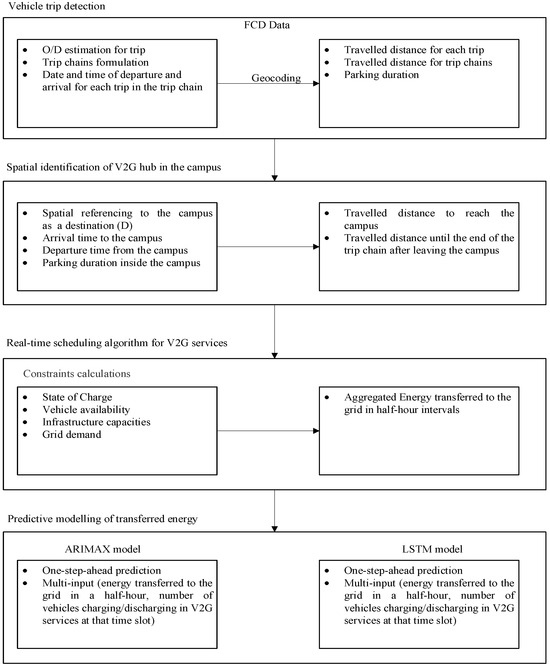 The proposed methodology outlines an innovative approach to integrating V2G services at the University of Rome Tor Vergata campus through four interlinked steps. First, large-scale FCD is harnessed to characterise vehicle movements, trip types, parking durations, and travel distances, identifying vehicles that are most likely to remain parked for extended periods and can serve the V2G network without affecting owners’ mobility. Second, spatial analysis is performed to identify potential V2G parking zones within the campus, a campus city model with centralised and high-density parking facilities ideal for energy aggregation. In the third step, a real-time scheduling algorithm is introduced to manage energy transfer timing, ensuring optimal grid support while respecting the constraints of vehicle availability, SoC, charging infrastructure, and grid needs. Lastly, predictive ARIMA and LSTM models are utilised for forecasting energy transfers based on historical mobility data, enabling more precise energy flow predictions and enhancing the overall efficiency of the V2G system. These four steps collectively facilitate a seamless, scalable V2G implementation that balances energy supply with mobility demands, positioning the university campus as a viable model for broader energy management solutions.