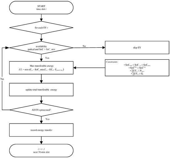 The operational logic of the real-time scheduling algorithm is illustrated in Figure 2. For each 30 min time slot, the algorithm iterates through every EV identified within the campus. It first checks vehicle availability by verifying that it is parked and its current SoC exceeds the minimum required level . This value is set to preserve the driver’s future mobility needs. For each available vehicle, the algorithm calculates the maximum transferable energy for that time slot, ensuring the transfer respects all system constraints, including infrastructure capacity and overall grid demand. This amount is aggregated to a running total. Once all EVs have been processed, the final energy transfer for the time slot is recorded, and the algorithm proceeds to the next time slot.