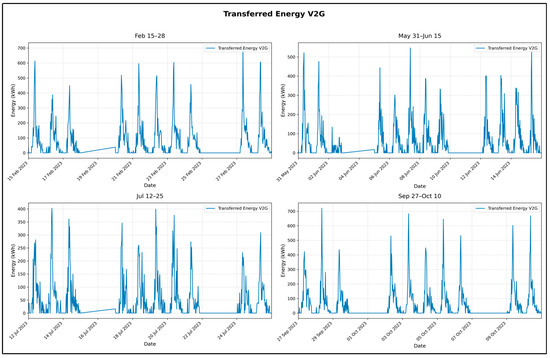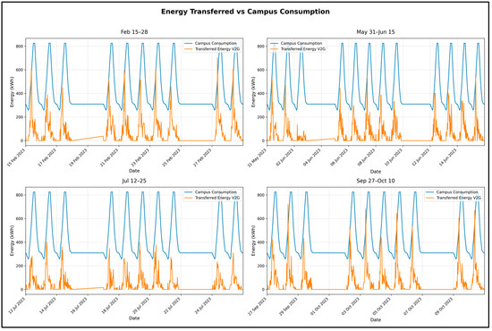 This section evaluates the real-world performance of the V2G services by analysing their ability to offset campus energy demand. The implementation of V2G services at the University of Rome Tor Vergata campus demonstrates their potential to reshape energy demand dynamics and enhance grid stability. Figure 8 illustrates the comparative analysis between campus energy consumption (blue curves) and V2G-transferred energy (red curves) across the four distinct periods: 15–28 February, 31 May–15 June, 12–25 July, and 27 September–10 October, as these intervals capture seasonal variations in academic activity, vehicle availability, and energy demand.