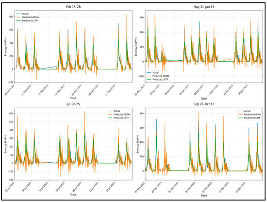 These models were selected for their established efficacy in energy forecasting: ARIMA handles linear trends, while LSTM captures nonlinear complexities inherent in mobility-driven energy patterns. Comparative studies confirm their superiority over simpler regression models for temporal data [38].