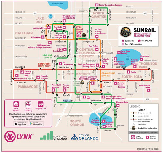 - LYNX. Routes & Schedules. Available online: https://www.golynx.com/maps-schedules/routes-schedules.stml (accessed on 1 March 2023).