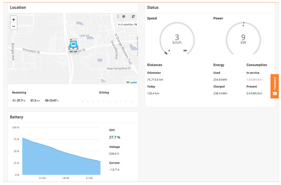 A combination of real-time and historical data from the EBs’ on-board devices was utilized to assess the energy efficiency and performance of the buses. The ELD is permanently logged with the bus shown in Figure 3. The data was accessed through an online dashboard called ViriCiti, shown in Figure 4. ViriCiti offers data and visualization tools that aid in the analysis process. For this study, the focus was on several vehicle parameters, including (1) the rate of energy consumption (kWh/km) and (2) total energy consumption (kWh). The energy consumption data includes both the energy consumed during driving and the energy consumed during idling, (3) distance traveled (km), (4) trip duration (hours), and (5) average speed (km/h). The hourly average speed was considered for analysis in this study, as well as (6) HVAC temperature inside the bus, (7) ambient temperature, and (8) the state of charge.