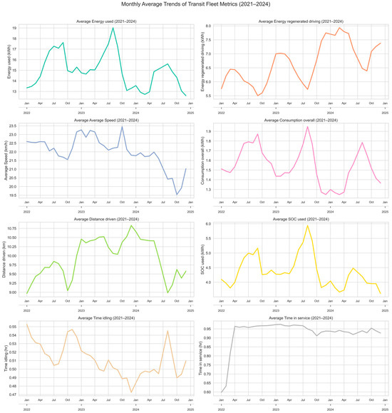 To uncover long-term temporal trends and shifts in operational behavior, the dataset was aggregated to monthly averages across the years 2021 to 2024. Eight key metrics were analyzed, covering energy usage, regenerative braking efficiency, vehicle speed, and time-in-service indicators. The resulting time series plots (Figure 5) reveal several noteworthy patterns: