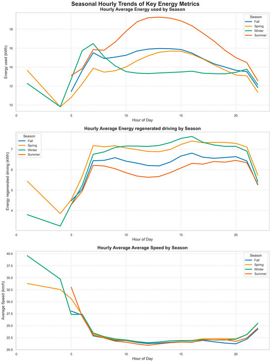 To understand temporal and seasonal trends in transit bus performance, the smoothed hourly averages of three key metrics—energy used, energy regenerated during driving, and average speed—were plotted by season. The results are presented in Figure 6.