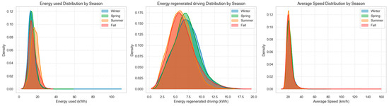 To investigate how key operational metrics vary in distribution across different seasons, Gaussian Kernel Density Estimation (KDE) plots were generated for three selected variables: energy used, energy regenerated during driving, and average speed. These smoothed density plots offer a more nuanced view of the data, highlighting central tendencies, spread, and seasonal shifts as shown in Figure 7.