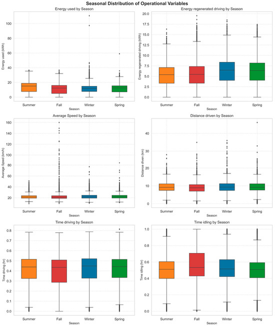 Boxplots were created to compare distributional differences across seasons for six critical variables: energy used, energy regenerated during driving, average speed, distance driven, time driving, and time idling as shown in Figure 8. These visualizations provide insight into the variability and central tendencies of the fleet’s performance under different environmental and operational conditions.