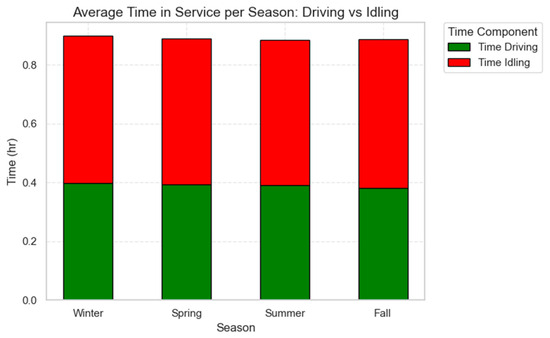 Understanding how electric buses allocate operational time between driving and idling is critical for identifying inefficiencies and optimizing overall fleet performance. Figure 9 presents a stacked bar chart comparing the average time spent in each mode across all four seasons.
