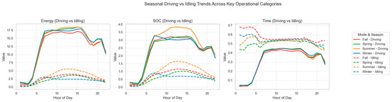 To further explore temporal and seasonal variations, hourly time series plots were generated for energy consumed during driving, energy idled, SOC used driving, SOC used idling, time driving, and time idling, as shown in Figure 10. These plots reveal clear behavioral cycles and seasonal effects. Driving-related energy consumption peaks sharply during midday hours, particularly in summer and spring, aligning with operational load and elevated HVAC usage. The energy idled remains relatively stable but increases slightly during midday and late evenings in summer, likely reflecting extended idling due to cooling demands. SOC usage during driving peaks in summer around midday, while SOC used during idling is low in winter, which means less consumption of HVAC demands.