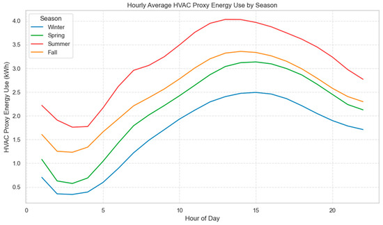 Across all seasons, energy consumption peaks between 12 p.m. and 5 p.m., coinciding with operational demand and possibly higher passenger load or HVAC usage during warmer hours. Summer exhibits consistently higher energy usage compared to other seasons, likely due to increased cooling demand and potentially higher service frequency. Winter shows relatively lower energy usage, suggesting reduced vehicle demand or milder operational loads.