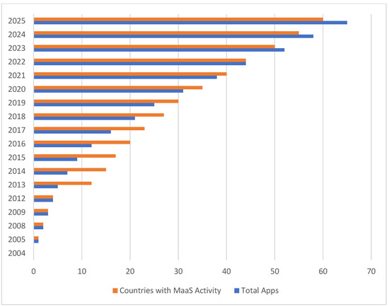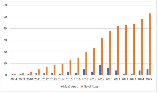 - The study provides a year-wise analysis of MaaS application deployment from 2004 to 2025, offering empirical insights into the growing share of MaaS solutions relative to total mobility applications worldwide.