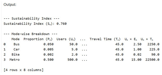 | # Sustainability Index S = w1 * (1 − sum_UE/(N * E_max)) + w2 * (1 − sum_UT/(N * T_max)) # Display the results in a DataFrame df = pd.DataFrame({ ‘Mode’: modes, ‘Proportion (Pn)’: P, ‘Users (Un)’: U, ‘Capacity (Kn)’: K, ‘Emissions/User (En)’: E, ‘Travel Time (Tn)’: T, ‘Un × En’: U * E, ‘Un × Tn’: U * T }) print(“\n--- Sustainability Index ---”) print(f”Sustainability Index (Sn): {S:.3f}”) print(“\n--- Mode-wise Breakdown ---”) print(df) |