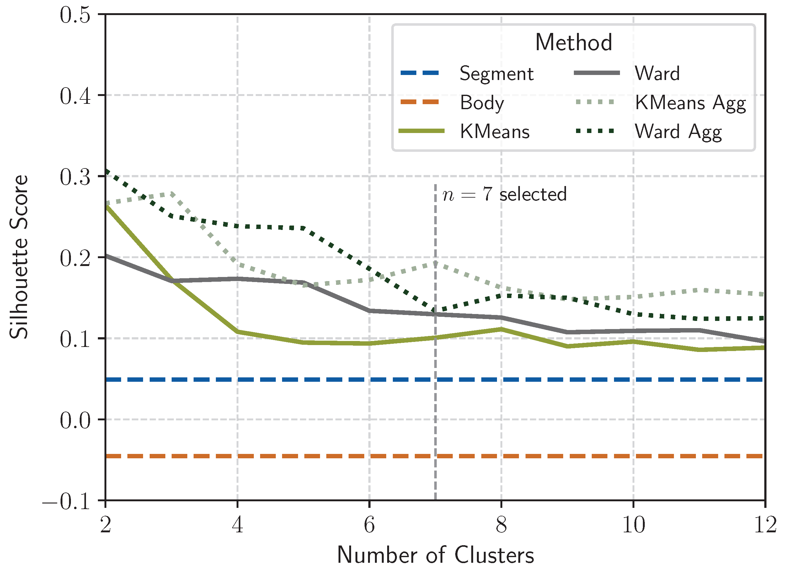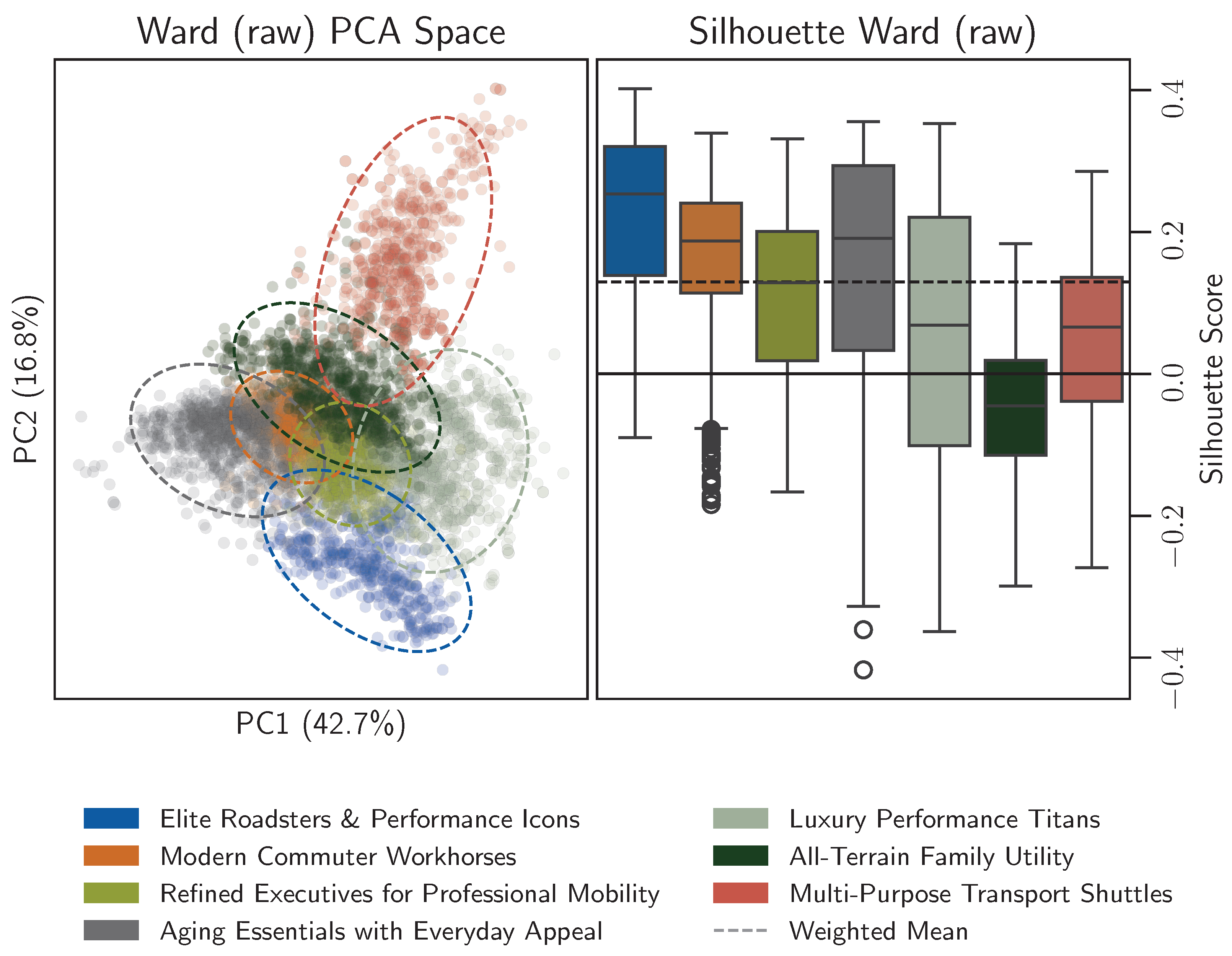 First and foremost, both clustering methods, k-means and Ward, on both feature sets, raw and aggregated, perform superior to the state of the art—for all numbers of clusters, our methods exhibit a higher silhouette score than the partition into segments or chassis types. The silhouette reach of the k-means and Ward clustering results reaches up to for two clusters and declines slightly with increasing number of clusters. A higher number of clusters generally allows for more specific labeling of the subgroups, yet a lower number of clusters increases separation. To select a specific value for further analysis, we opt for the compromise for two reasons: Firstly, it is equal to the number of vehicle segments, and thus maximizes comparability with the state of the art. Secondly, the k-means algorithm on aggregated features exhibits a local maximum in its silhouette here, and thus hints at an inherent partition into seven groups within the dataset.