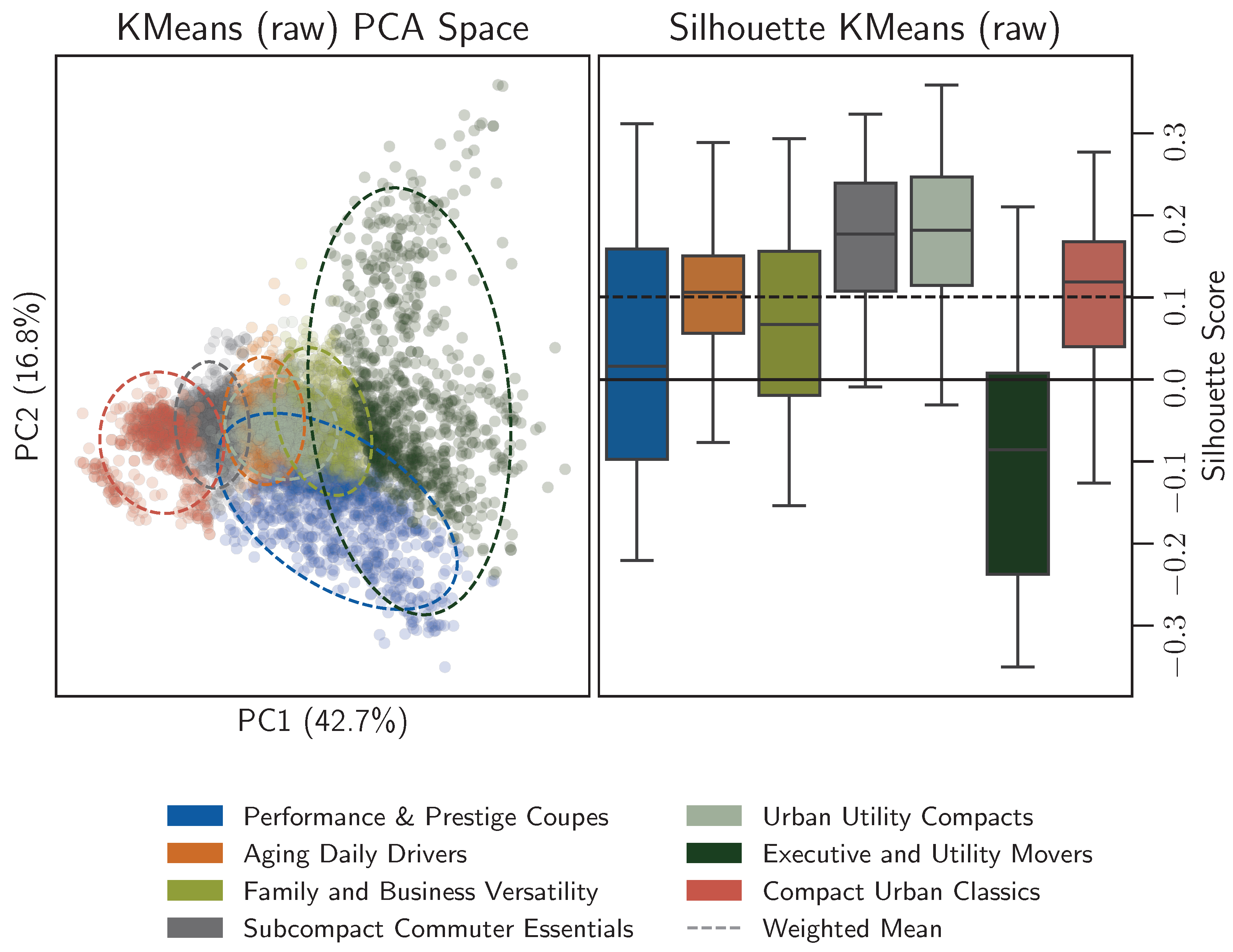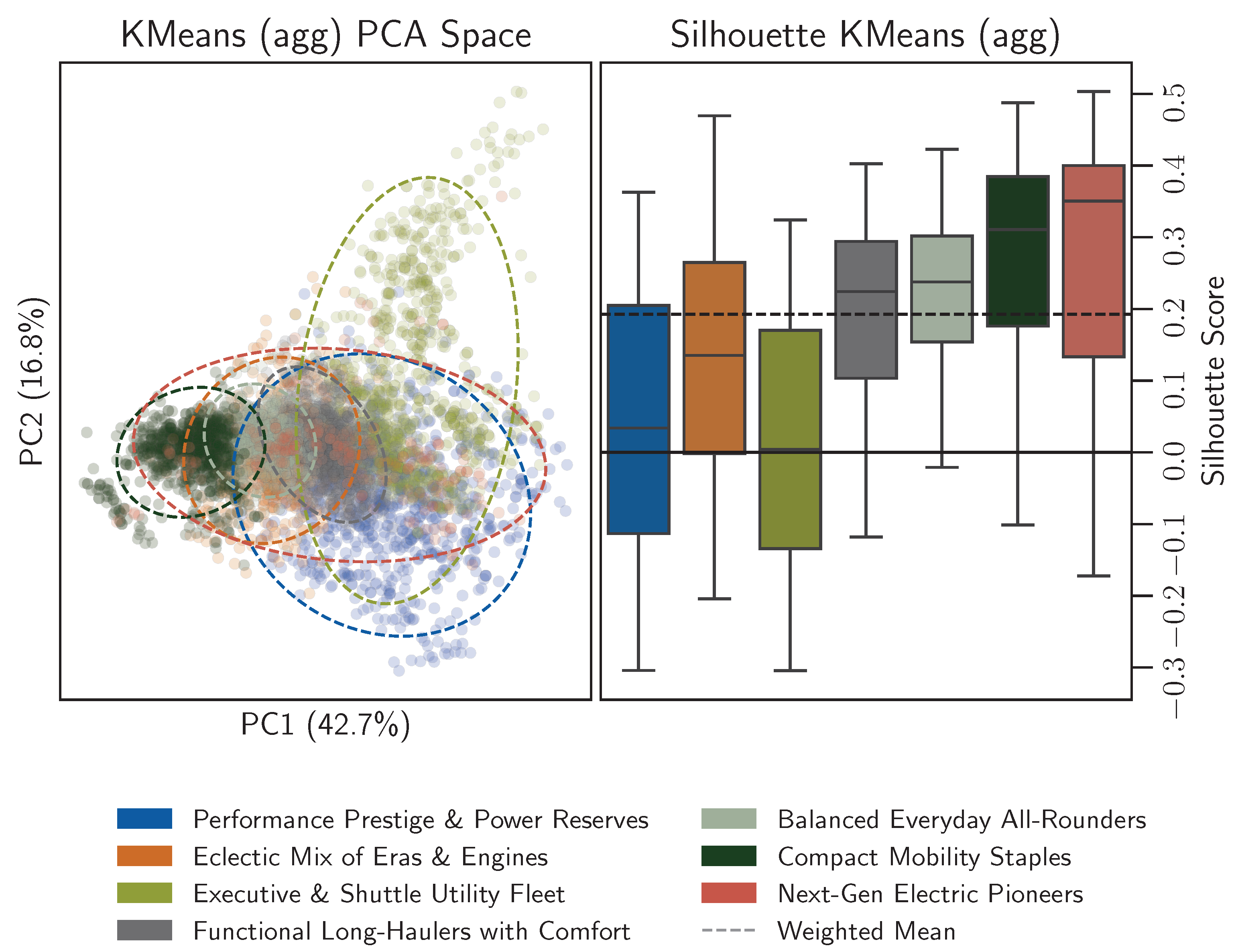 The Executive & Shuttle Utility Fleet has a high variance and a slightly negative average silhouette, but all other clusters are positive. Going even further, this is the first approach that ensures that 5 out of seven clusters even have non-negative lower quartiles. Analyzing single vehicles in this cluster, this variance can be explained as on the PC1 axis, almost all vehicles with a value of more than 5 are within this cluster. This area covers especially utility vehicles, e.g., VW Crafter, Mercedes-Benz Sprinter, and Ford Transit. On the lower right side, more SUV-like vehicles are located, e.g., BMW X7, Mercedes-Benz G350, and Land Rover Discovery. Centered vehicles within this cluster are a mixture of larger vehicles in general, e.g., VW Sharan, Audi Q5, and Opel Insignia. Interestingly, the Next-Gen Electric Pioneers has the highest distinction. Inspecting the distribution of the four engineered features, we observe that the ecological factor is significantly higher than in other clusters, with a mean value of . Further, the economic factor is above average with a mean of . Both seem plausible as BEV are superior in terms of emissions and energy efficiency, which also supports the economic performance. Moreover, the clustering algorithm found a cluster consisting only of BEV on its own without utilizing a discrete variable for this. We assume a mix of the low ecological and economic factors is responsible for this cluster. With only one outlier, a VW e-Crafter, the cluster is well described. The overall spread is more along the PC2 axis, spanning from smaller electric vehicles such as the Smart ForTwo Cabrio EQ up to large BEV such as the BMW iX M60 or the Tesla Model X Plaid.