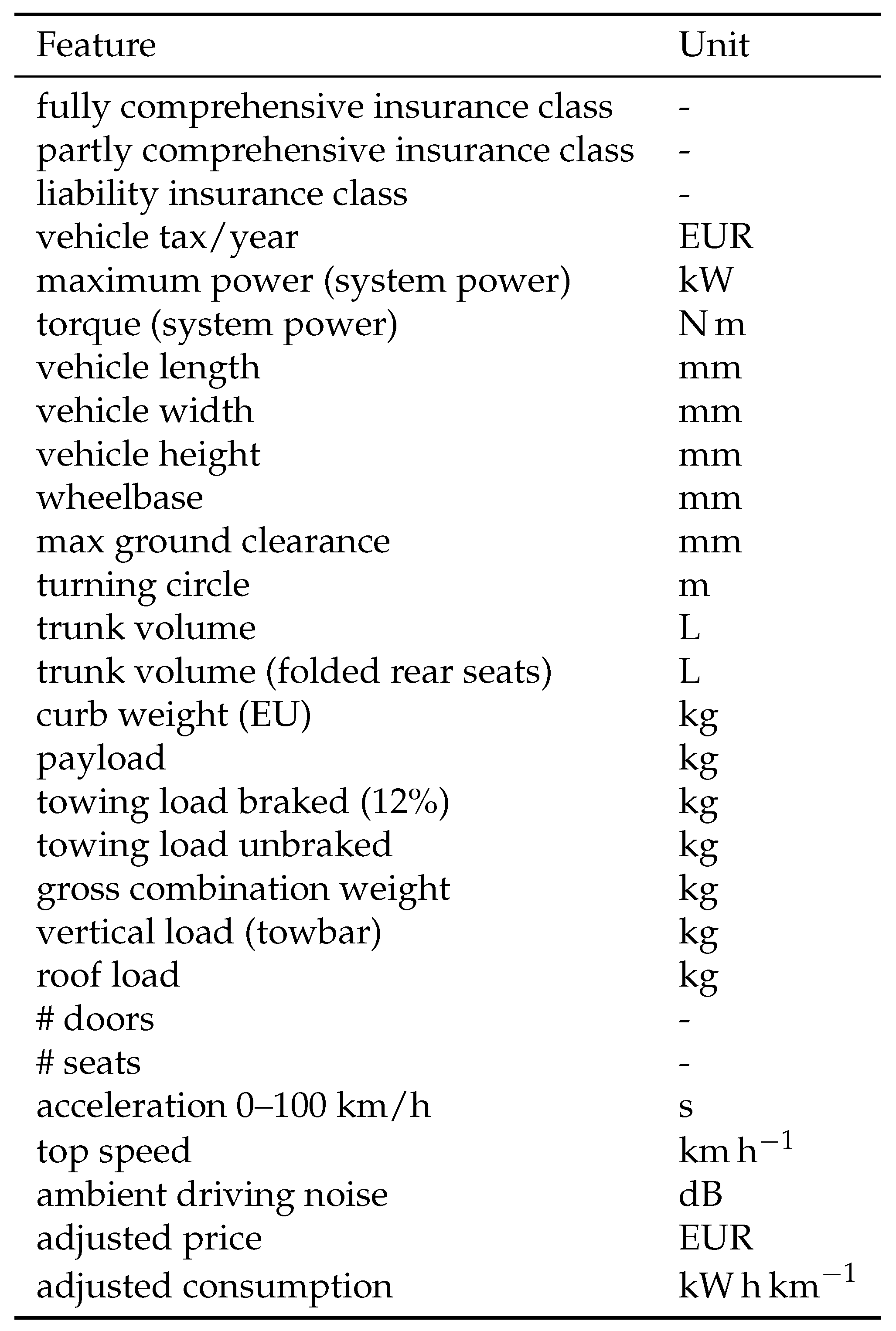 32] proposed their customer-oriented concept assessment tool to utilize certain technical parameters to create user-related features. While they provide a user-friendly approach to compare multiple passenger cars, they neither take them into perspective with existing vehicle classes nor do they extend their concept to develop a novel segmentation approach.